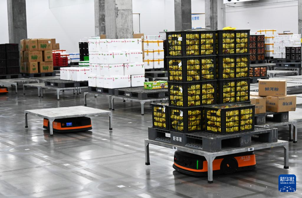 4月23日,在襄阳市樊城区好邻居生鲜物流中心,两台智能运送机器人在货物运送轨道上“相遇”,按优先级先后通过。