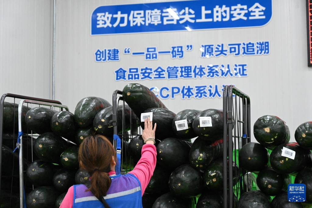 4月23日,在襄阳市樊城区好邻居生鲜物流中心,操作员为一批冬瓜“赋码”。“赋码”是指将商品贴上独有的二维码,以实现后续流程的自动分拣等功能。