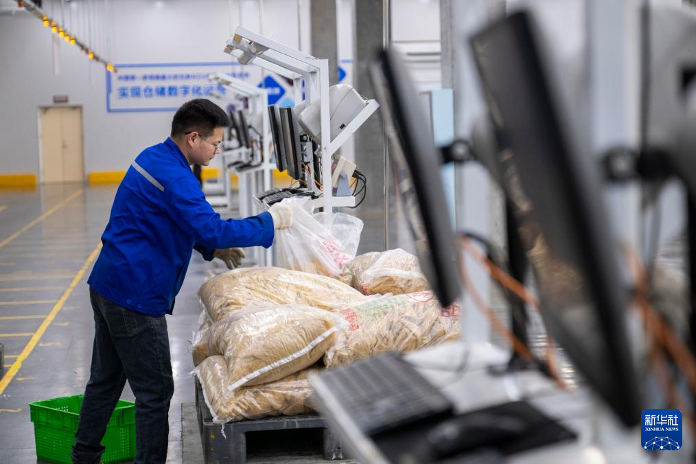 4月23日,在襄阳市樊城区好邻居生鲜物流中心,工作人员通过电脑向智能运送机器人下发需求并取得对应的货物。