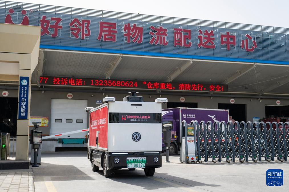 4月23日,一辆无人智能配送车驶出襄阳市樊城区好邻居生鲜物流中心,根据指令向超市门店送货。