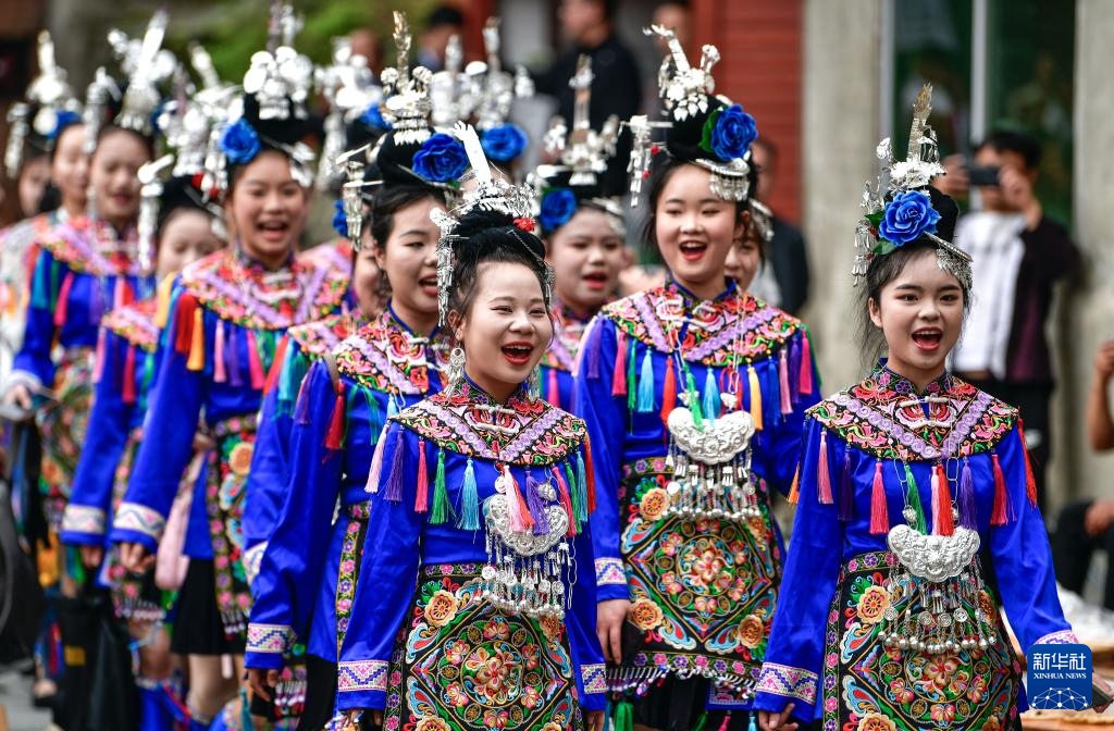 4月26日,少数民族姑娘们在贵州省从江县加榜梯田“开秧门”巡游仪式中演唱歌曲。