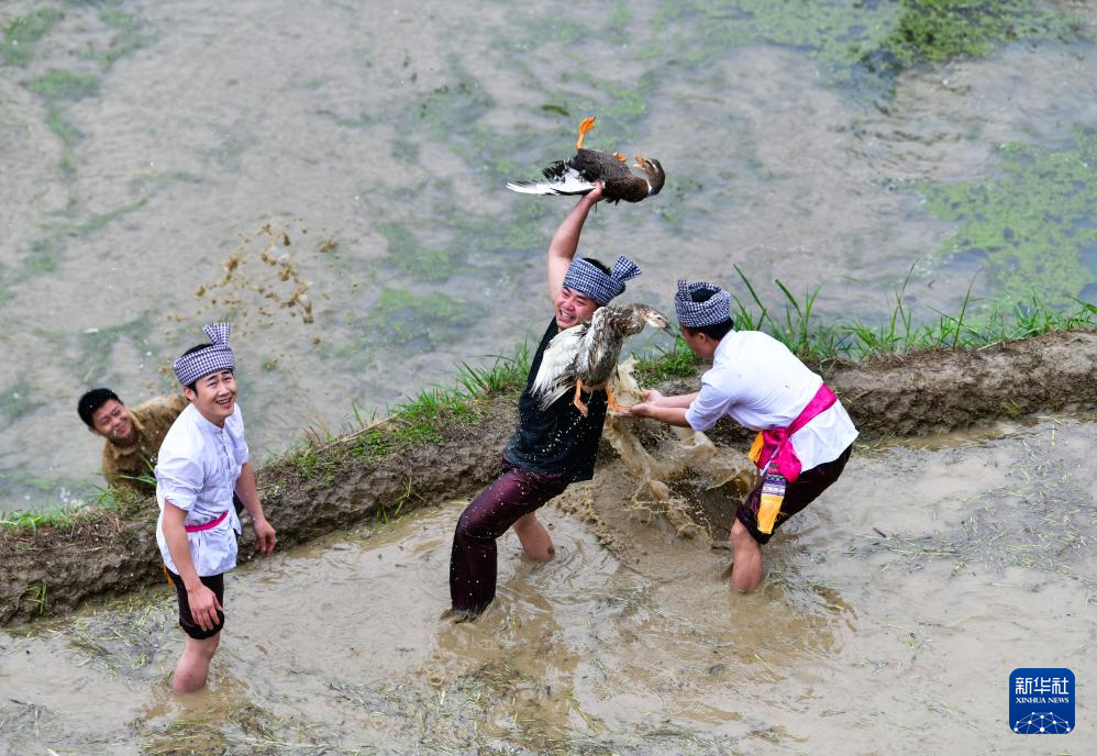 4月26日,村民在贵州省从江县加榜梯田上参加稻田抢鸭活动。