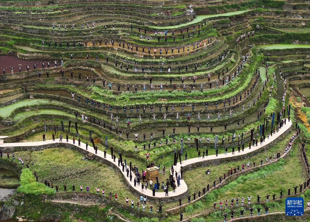 4月26日,村民在贵州省从江县加榜梯田上参加“开秧门”春耕仪式(无人机照片)。