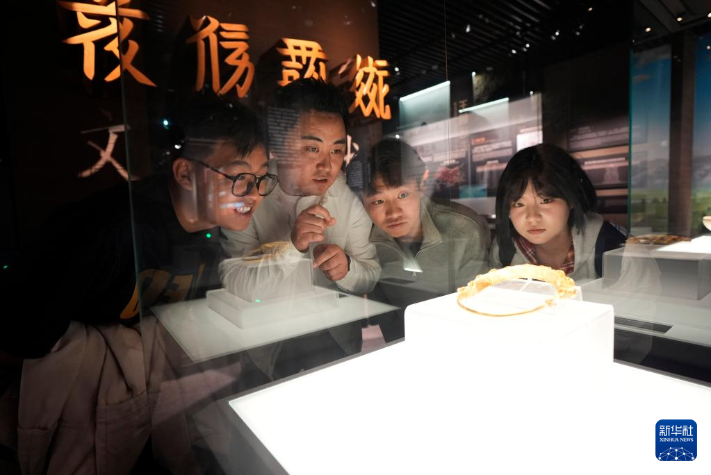 4月23日,“丝路宁夏文创”团队成员张哲(左一)、景利军(左二)、赵亮(右二)、杨柳钰在宁夏银川西夏陵博物馆采集文创素材。