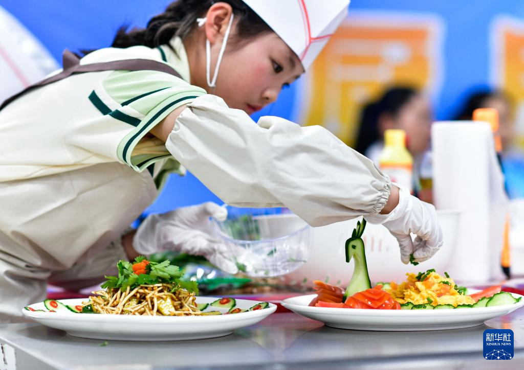 4月27日,学生在贵州省龙里县中等职业学校赛场参加烹饪比赛时摆盘。