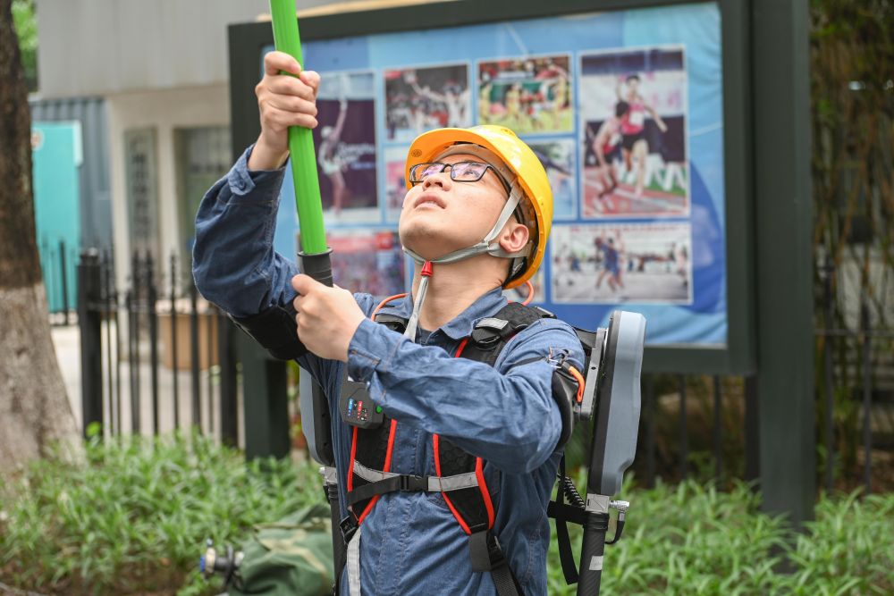 5月27日,工作人员佩戴智能外骨骼装备演示操作绝缘杆。新华社记者 肖恩楠 摄