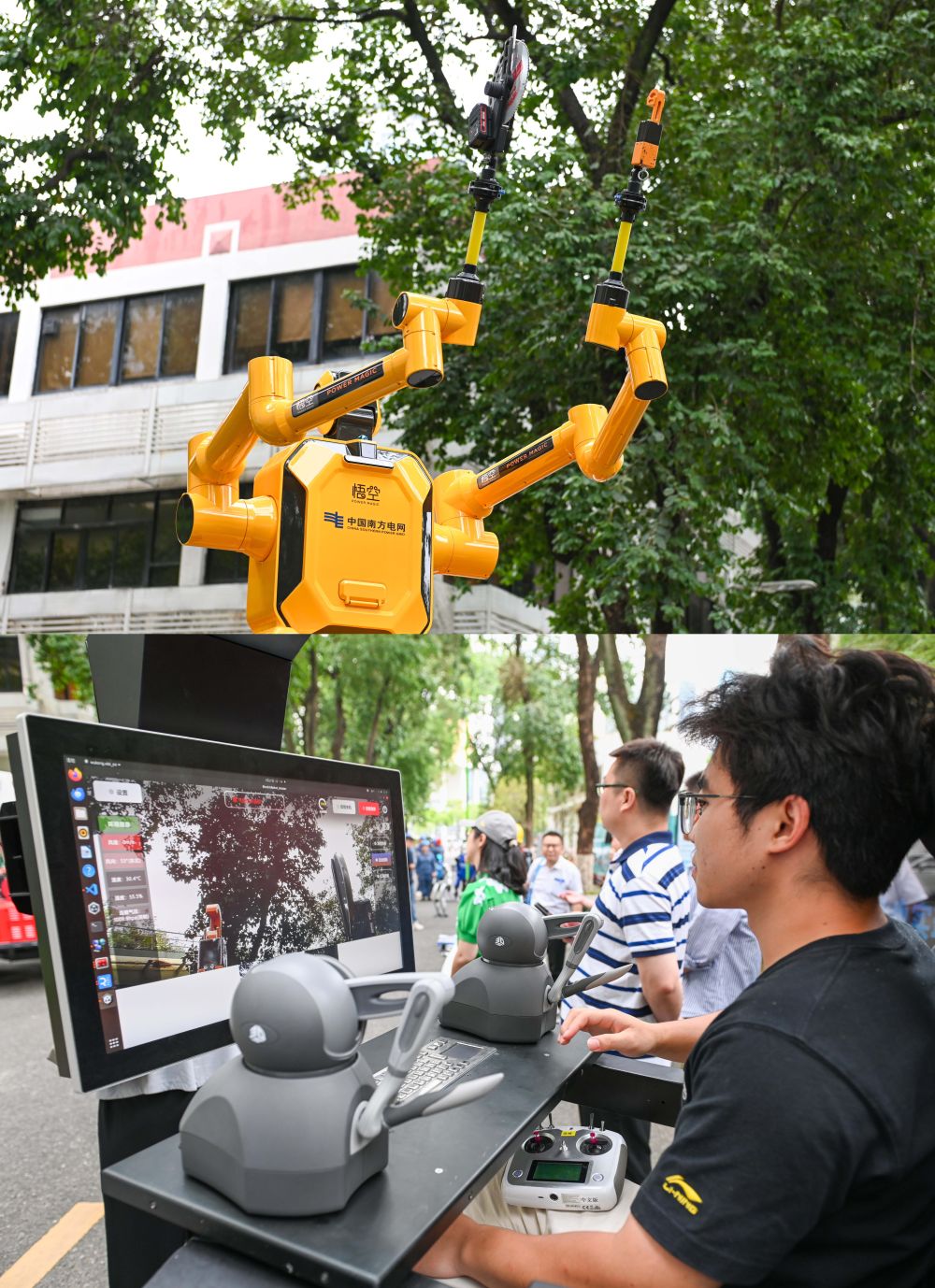 这是一张拼版照片:上图为“悟空”带电作业机器人;下图为在地面对机器人进行操控演示的工作人员(5月27日摄)。新华社记者 肖恩楠 摄