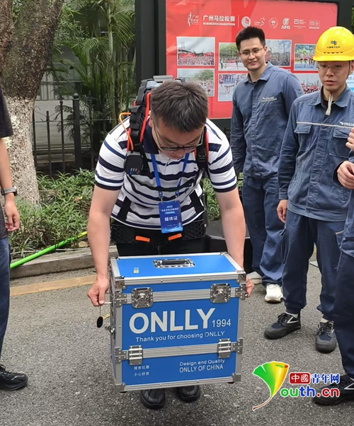 记者体验穿着机械外骨骼搬运重物。中国青年网记者 高蕾 摄