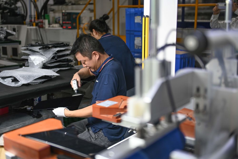 5月28日,质检人员在川崎汽车产业园近零碳示范区采用智能光学检测仪与人工复检双保险模式对零部件进行检测。新华社记者 肖恩楠 摄