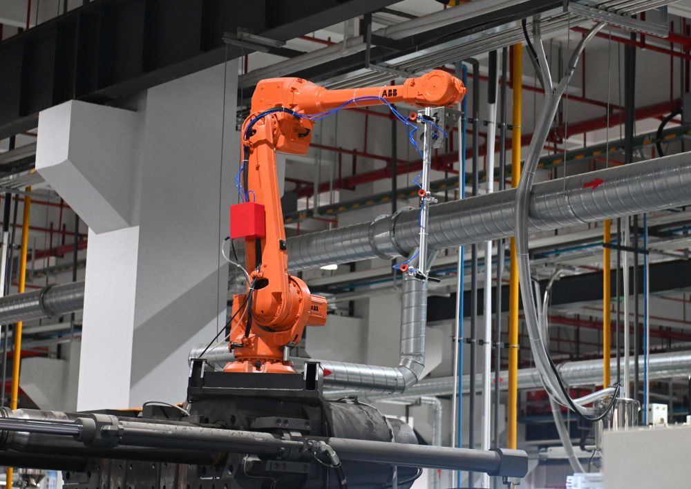 在川崎汽车产业园近零碳示范区的车间拍摄的可自主规划最优抓取路径的智能机械臂(5月28日摄)。新华社记者 肖恩楠 摄