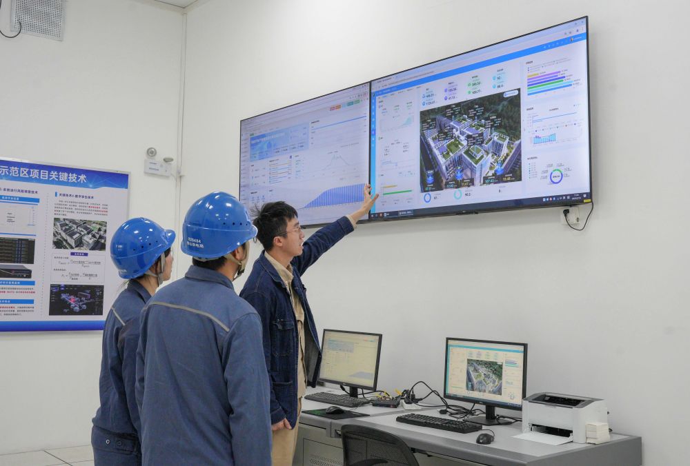在川崎汽车产业园近零碳示范区的主控室,工作人员观看能碳管理监控平台的实时数据(2月14日摄)。新华社发