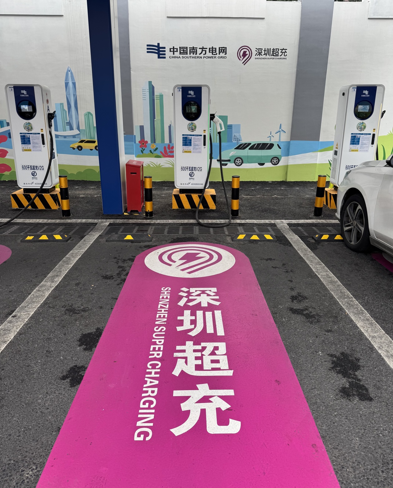 调研团率先来到了位于城市中心的深圳莲花山超充站,该电站共有27台充电桩,可同时满足46辆车充放电,其中有4台是具备最大功率600千瓦充放电能力的超充桩,最快能以“一秒一公里”的速度充放电。该站还是深圳首个“绿车充绿电”试点站,车主可以在这里充上100%绿电,真正实现“绿”动全城。