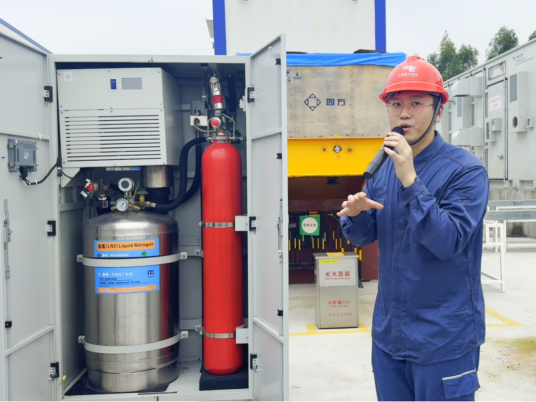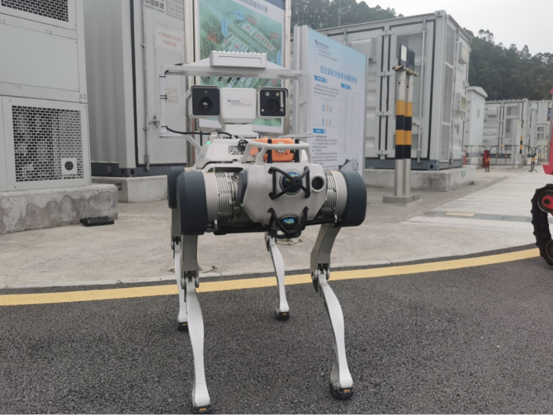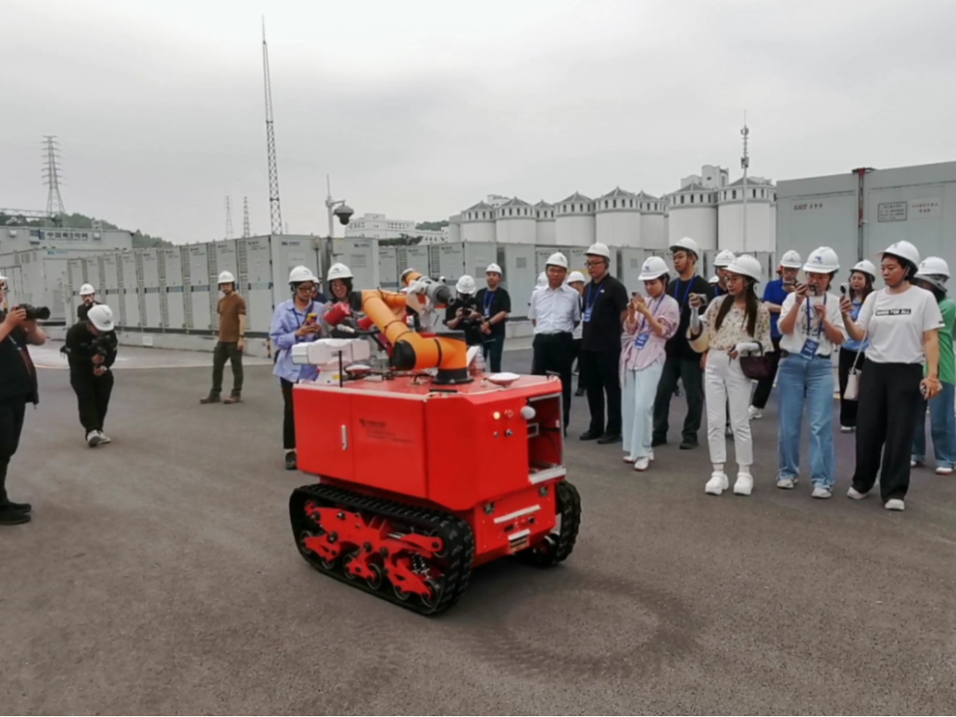 ▲在现场,南方电网工作人员介绍储能站内日常运维“好帮手”——履带式消防机器人、巡检机器狗和灭火抑爆工程样机。(姚纯铭 陈力文 摄)