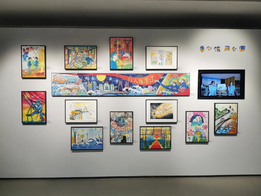 在横琴数字零碳岛共享实验室的“童心绘·同心圆”的展墙上,挂满一幅幅粤澳青少年创作的粤澳情深主题画作。(姚纯铭 摄)