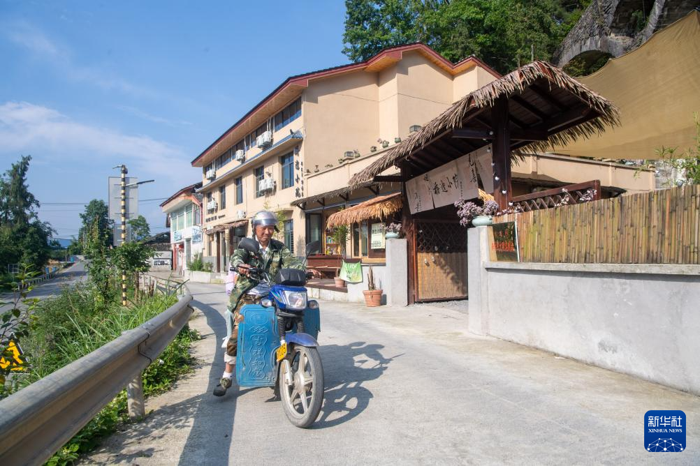 6月11日,村民骑摩托从桥边小院民宿前经过。