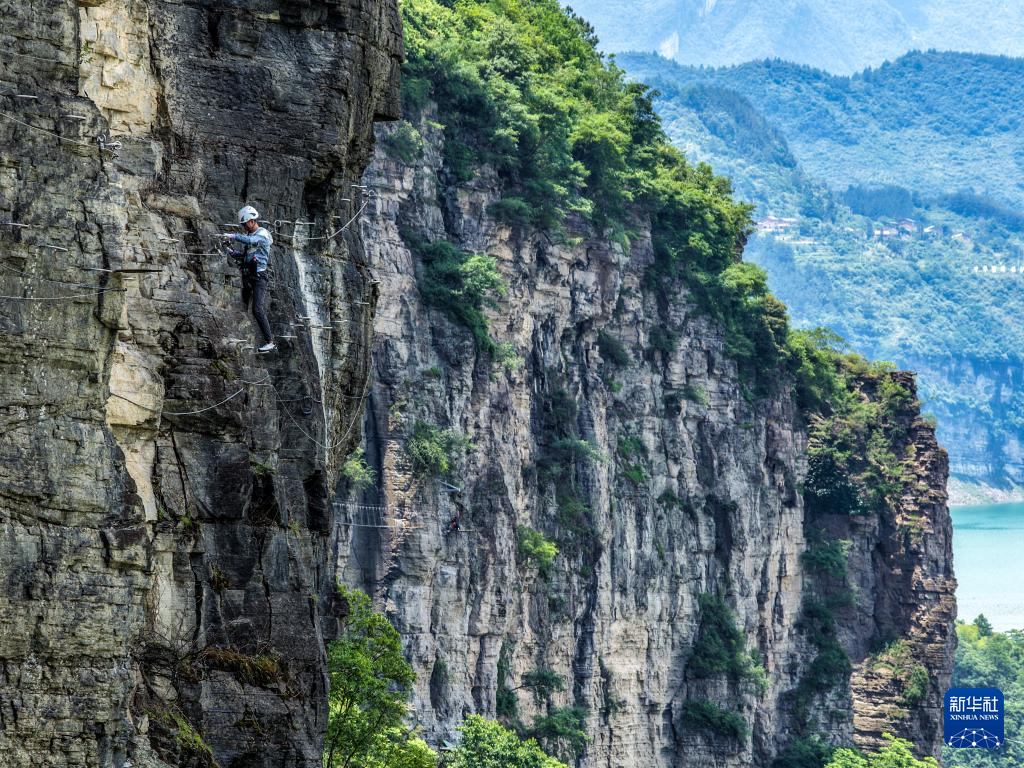 6月11日,在大金佛山环山趣驾路线上的飞拉达项目基地,游客在体验攀岩项目(无人机照片)。