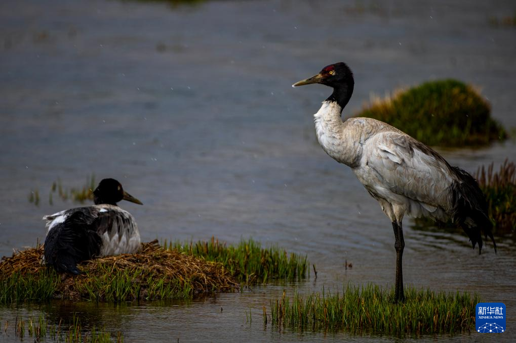 一对黑颈鹤在西藏那曲市申扎县的湿地上照顾刚出壳的雏鸟,一只将其护在身下保持温暖,另一只则在旁保持警戒(6月4日摄)。