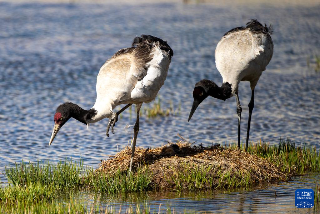 一对黑颈鹤在西藏那曲市申扎县的湿地上“换班”照顾刚出壳的雏鸟(6月4日摄)。