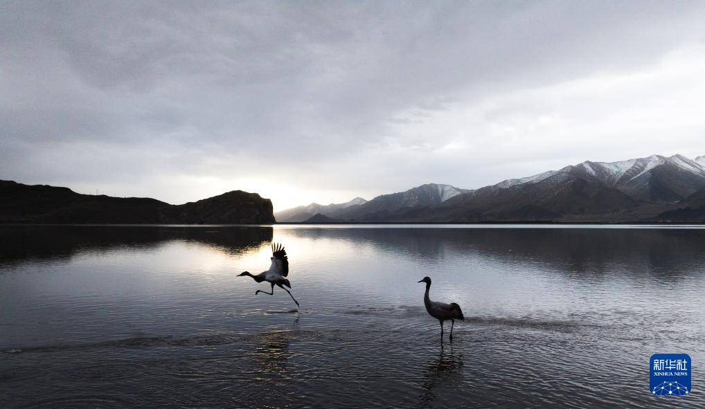 这是在西藏拉萨市林周县虎头山水库拍摄的黑颈鹤(无人机照片,3月8日摄)。