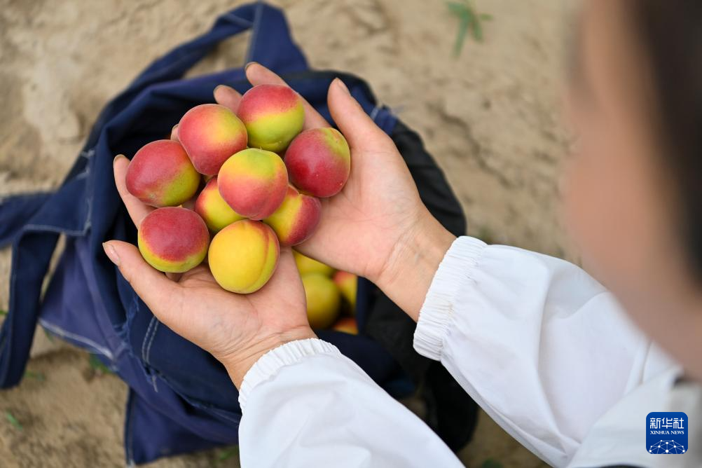 山西省吕梁市兴县蔡家崖村村民展示刚采摘的红梅杏(7月1日摄)。