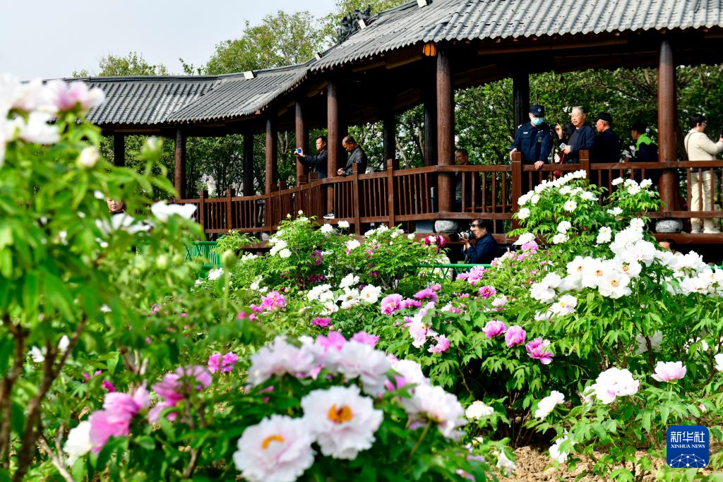 4月8日,在菏泽市曹州牡丹园,盛开的牡丹吸引游客驻足欣赏。