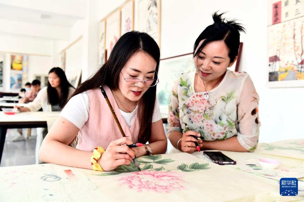 6月2日,在菏泽市巨野县龙堌镇龙海书画院,农民画师探讨交流工笔画创作。