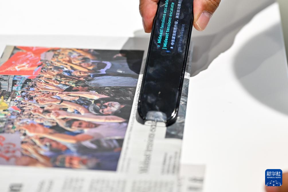 7月2日,一名观众在科大讯飞人工智能体验馆体验一款词典笔的翻译功能。
