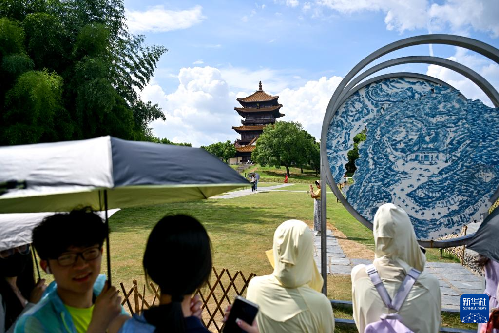 7月13日,游客在江西省景德镇市陶阳里历史文化街区一处网红打卡点排队留影。