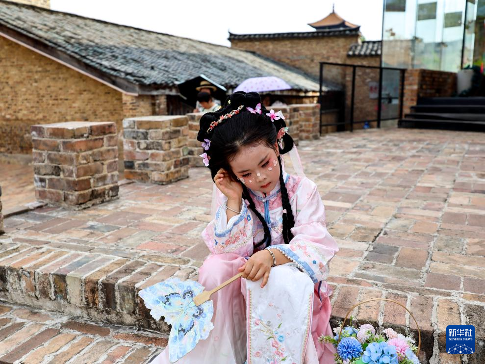 7月13日,一名小游客在江西省景德镇市陶阳里历史文化街区休憩。