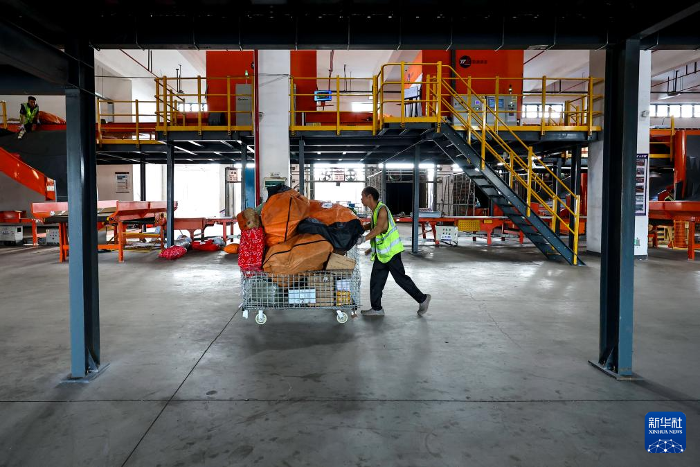 7月11日,在位于江西省上饶市横峰县的一处物流转运中心,工人转运快递包裹。