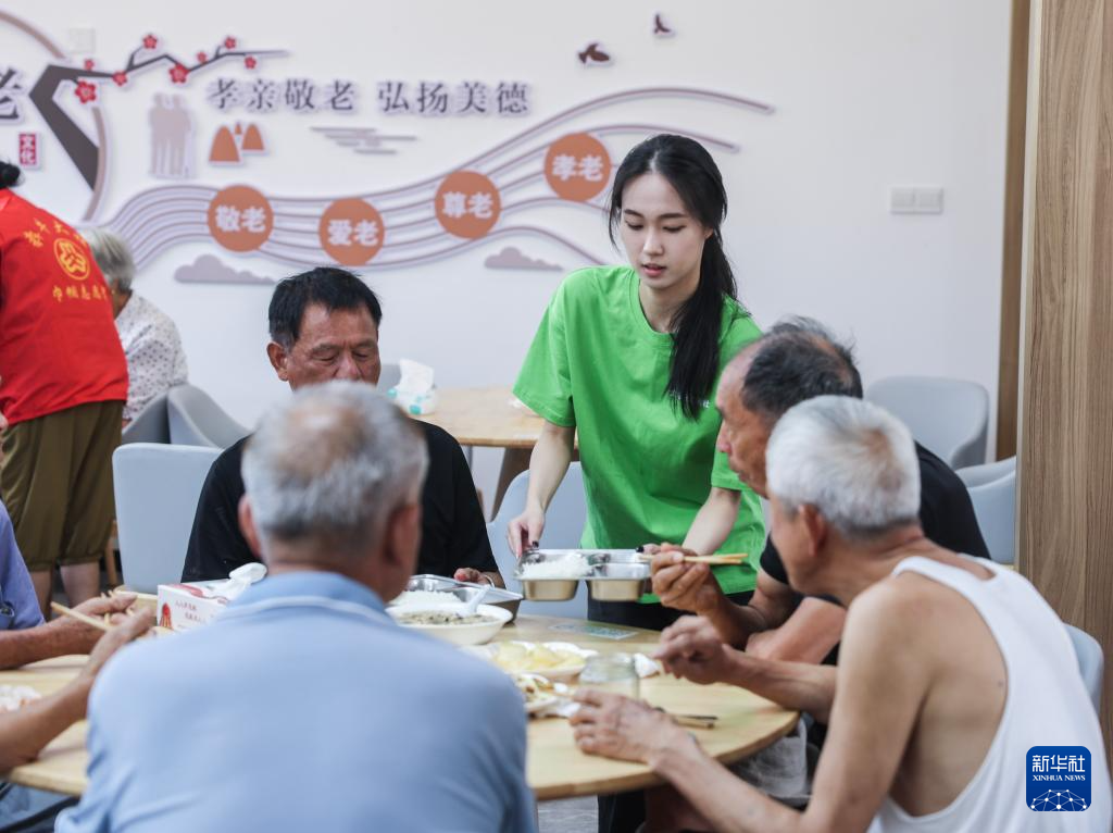 7月15日,在诸暨市安华镇丰江周村爱心食堂,浙江农林大学暨阳学院的学生开展助餐志愿服务。