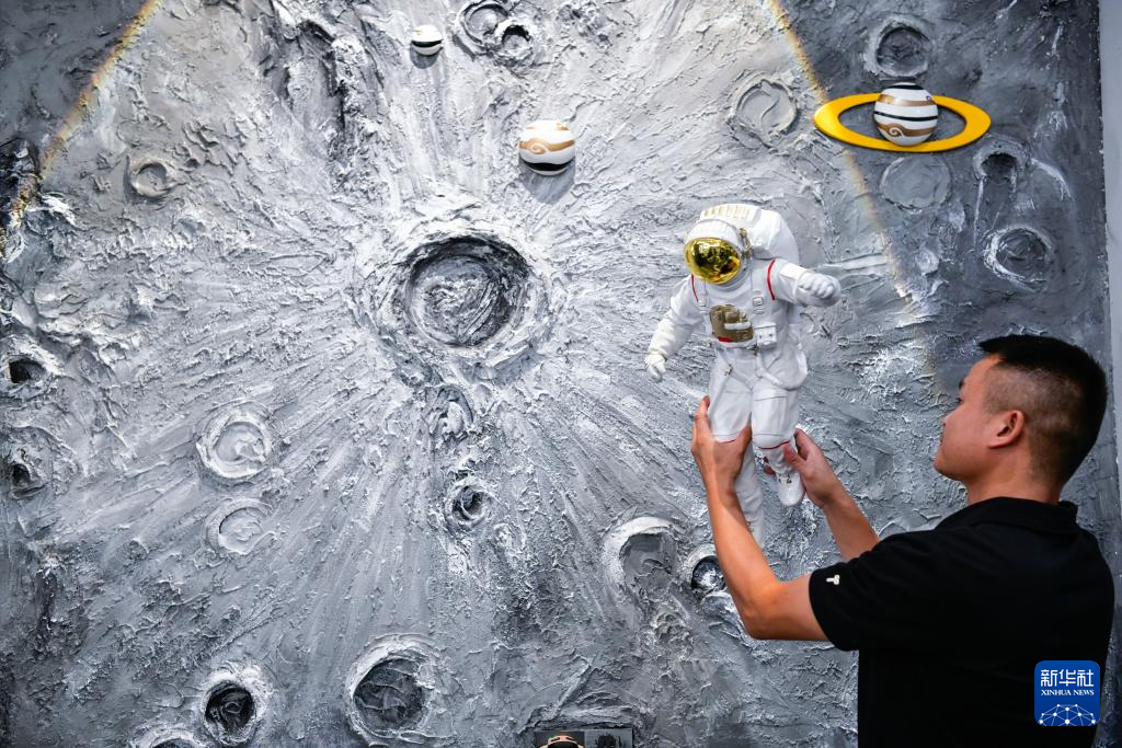 贵州省平塘县克度“天文小镇”的民宿负责人刘成亮将宇航员装饰挂在墙上(7月9日摄)。