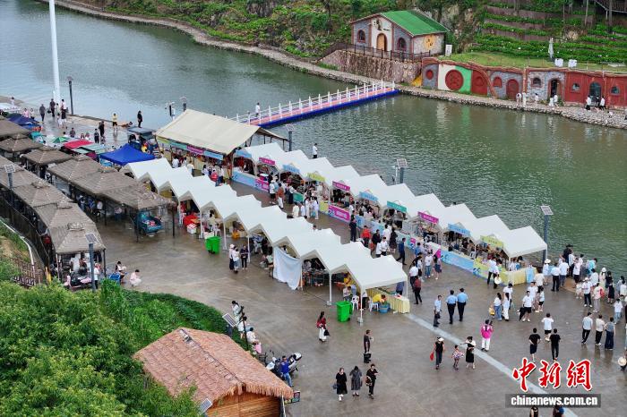 图为7月18日,游客在周宁县泗桥乡溪口村游玩避暑。(无人机照片)中新社记者 王东明 摄