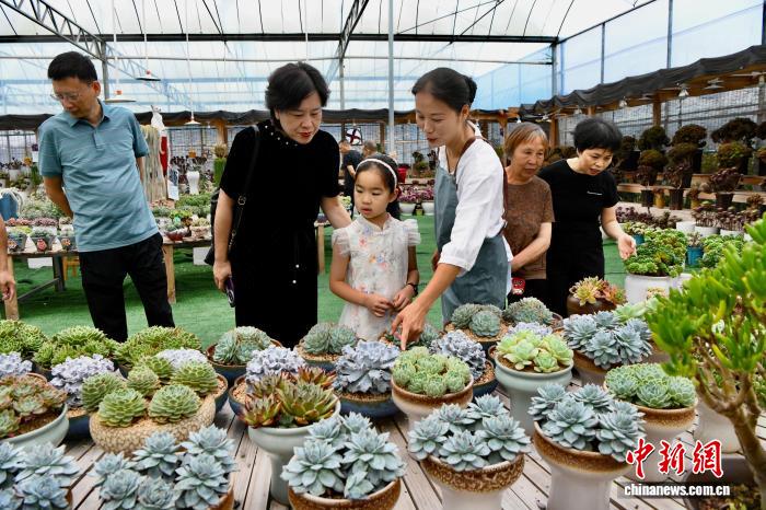 图为7月19日,小朋友在周宁多肉种植园大棚内体验制作多肉盆景。中新社记者 王东明 摄