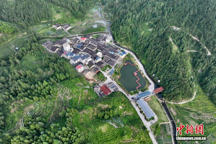图为7月17日,空中俯瞰海拔1200米的周宁县浦源镇紫云村,该村每年夏天都会吸引许多“银发族”前来避暑。(无人机照片)中新社记者 王东明 摄