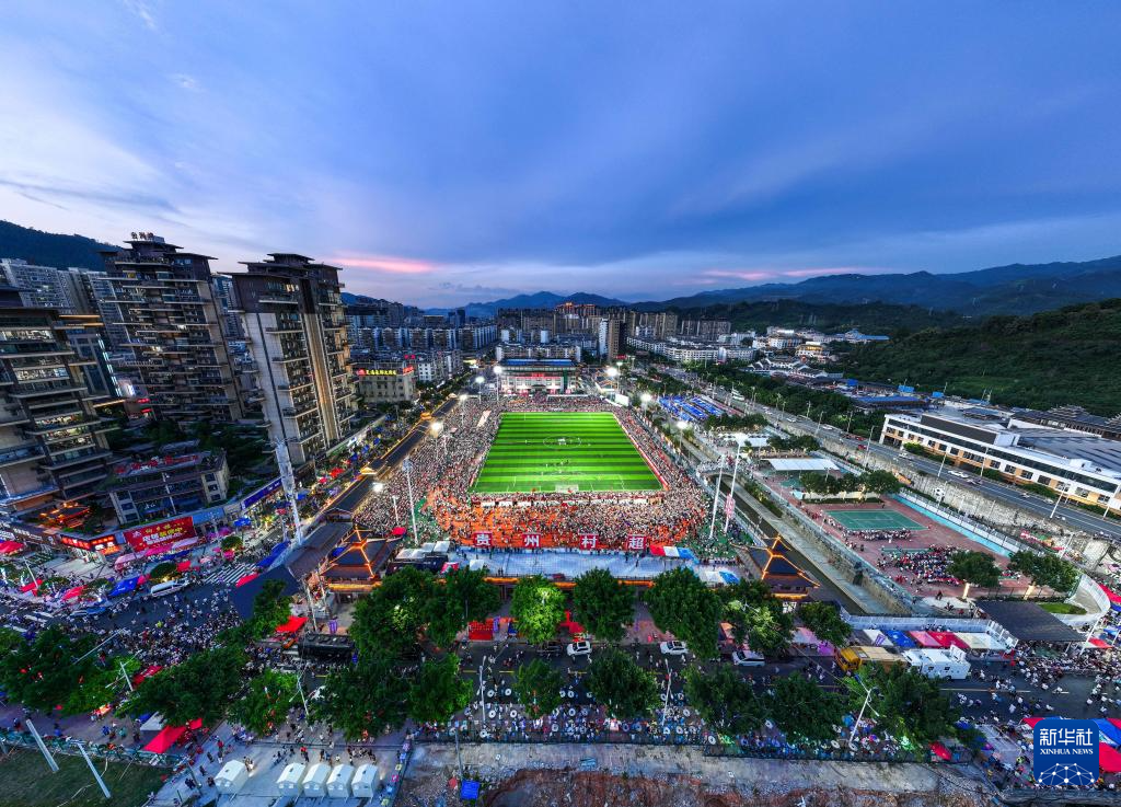 7月26日,人们在榕江“村超”球场观看球赛(无人机照片)。