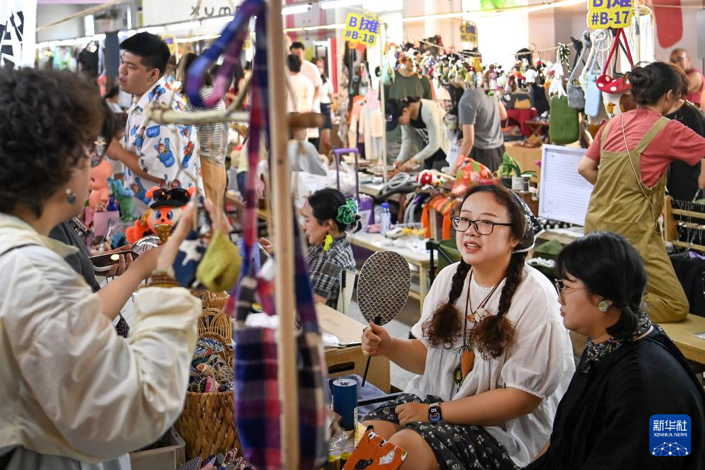 7月5日,摊主在西仓市集文创公园内的“新二手市集”上与游客交流。