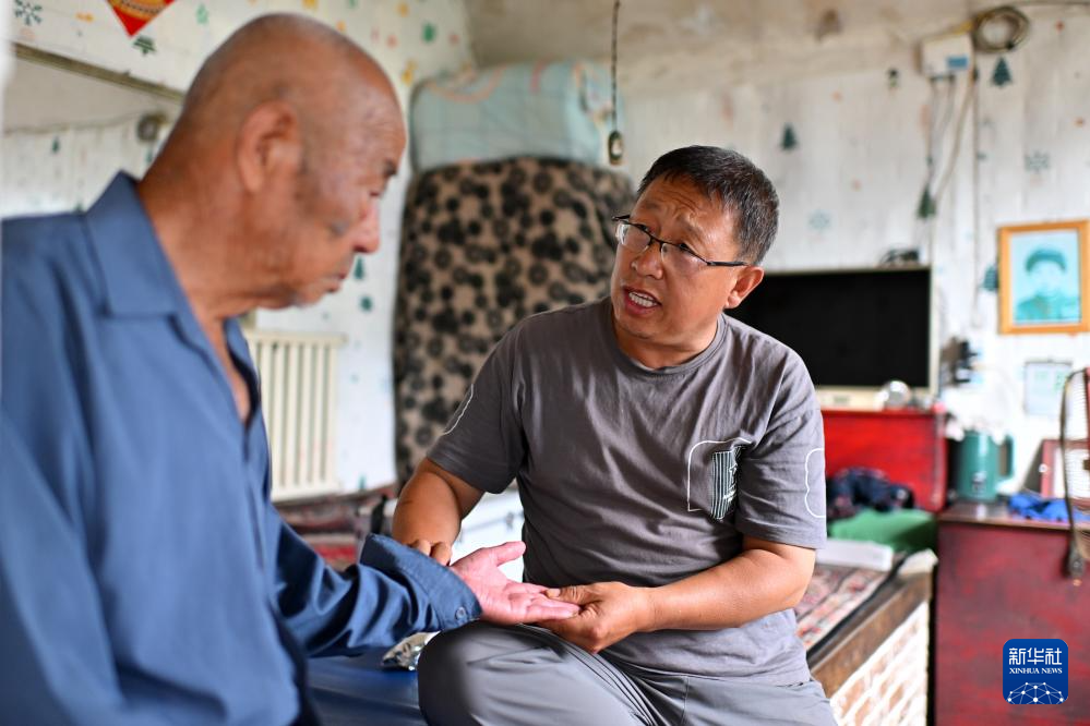在石楼县龙交乡德义河村,乡村医生辛平(右)为村民做检查(7月24日摄)。