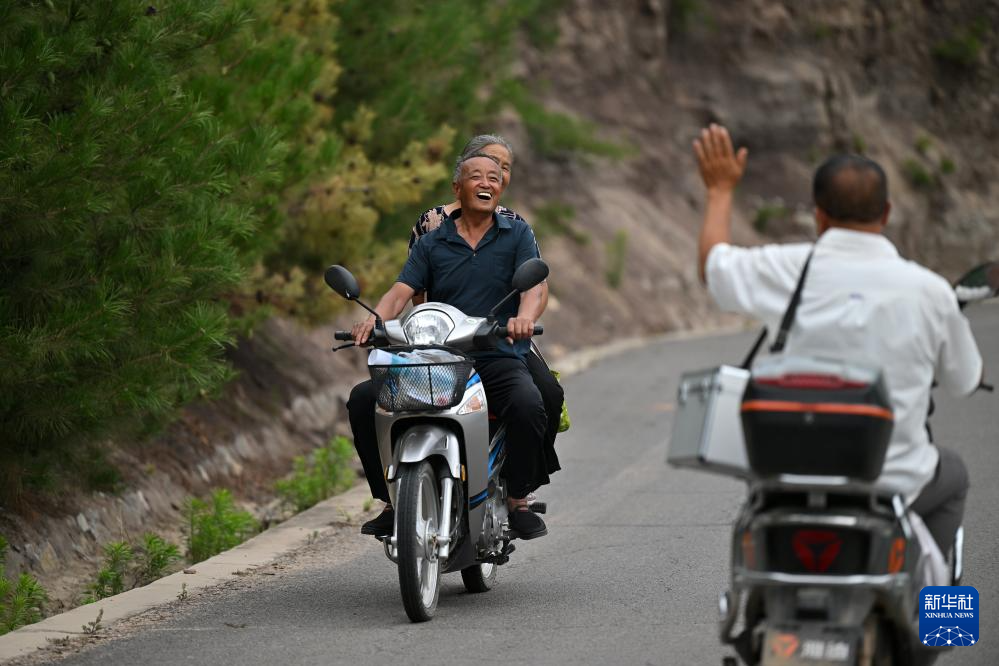 在出诊途中,乡村医生辛平(右)和村民打招呼(7月23日摄)。
