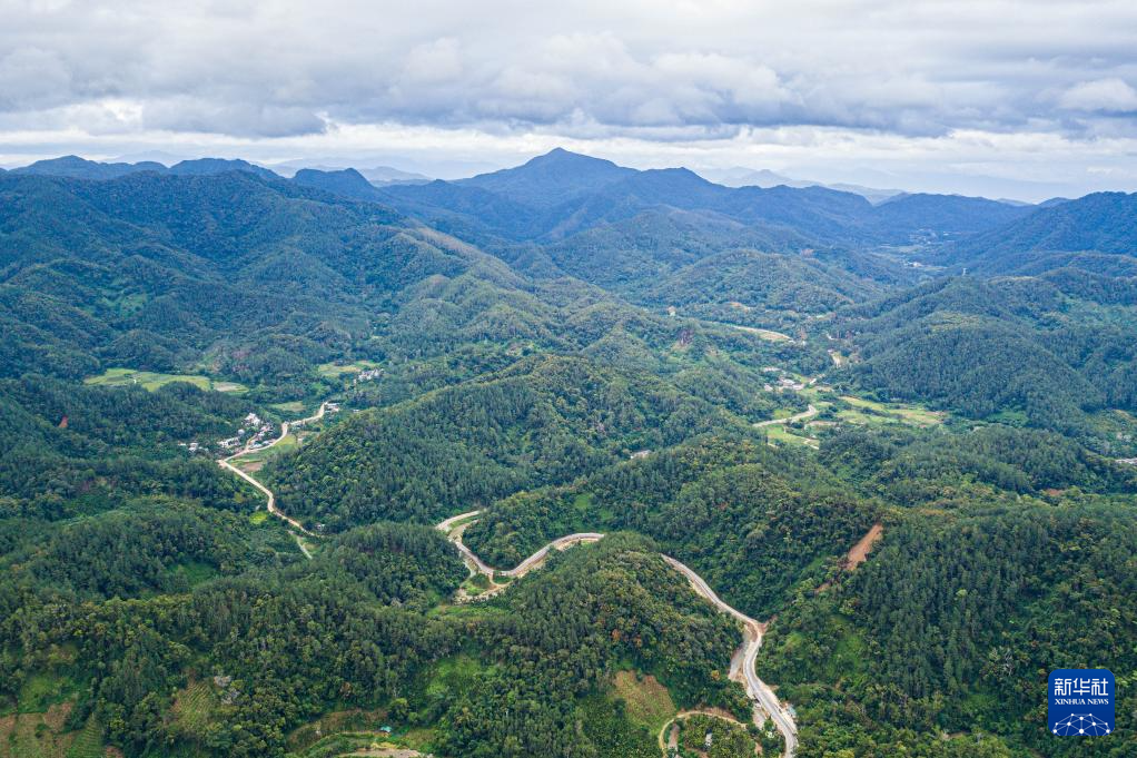 在海南保亭毛感乡拍摄的热带雨林及蜿蜒其中的环热带雨林国家公园旅游公路(无人机照片,7月22日摄)。
