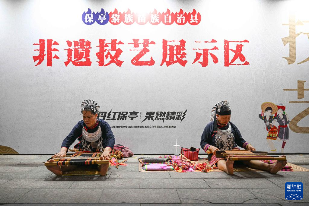 黎族织娘在海南保亭红毛丹文化节上展示黎族织锦技艺(7月12日摄)。