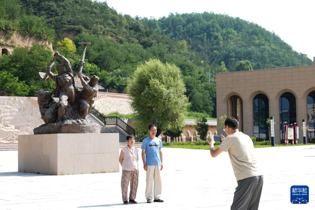 游客在南泥湾大生产纪念广场的雕塑前合影(7月29日摄)。