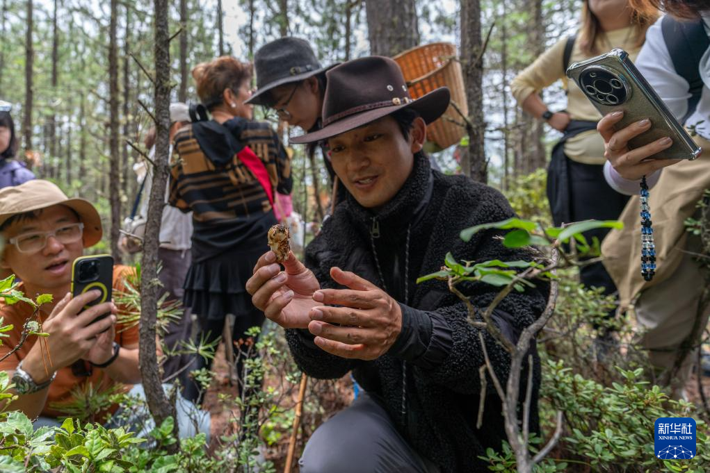 7月25日,春批(中)在香格里拉市吉迪村向游客展示松茸采摘过程。