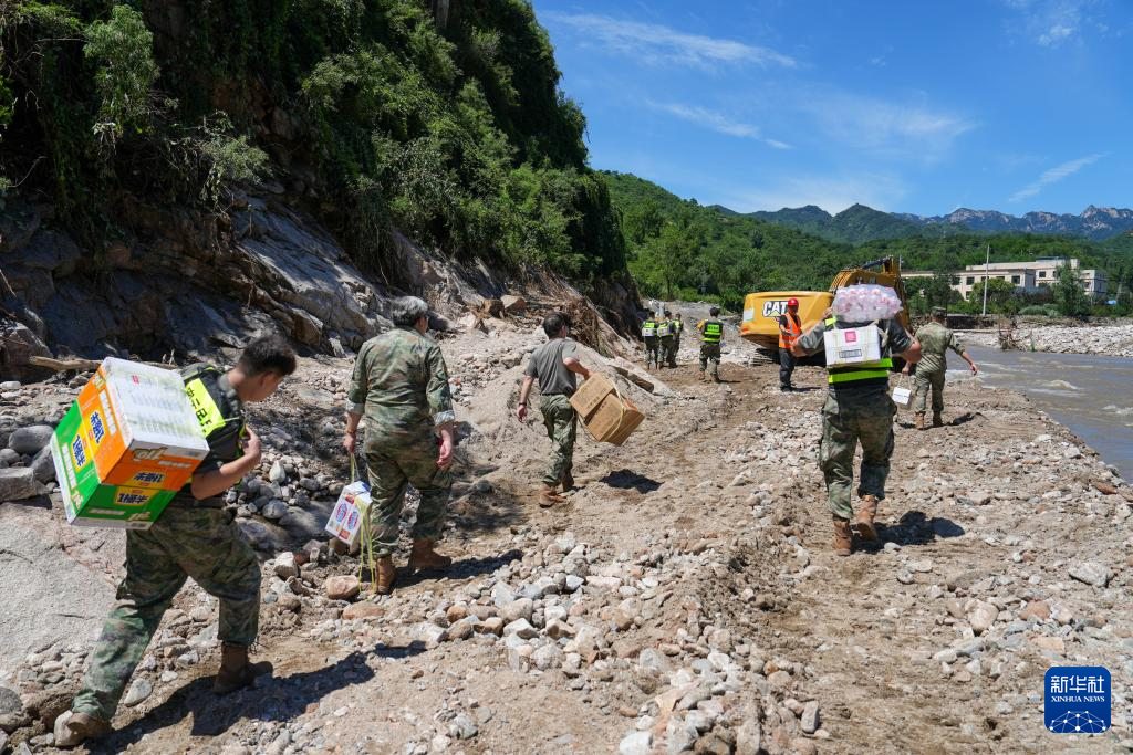 7月30日,在密云区冯家峪镇,救援人员为道路被阻断的村庄运送生活物资。