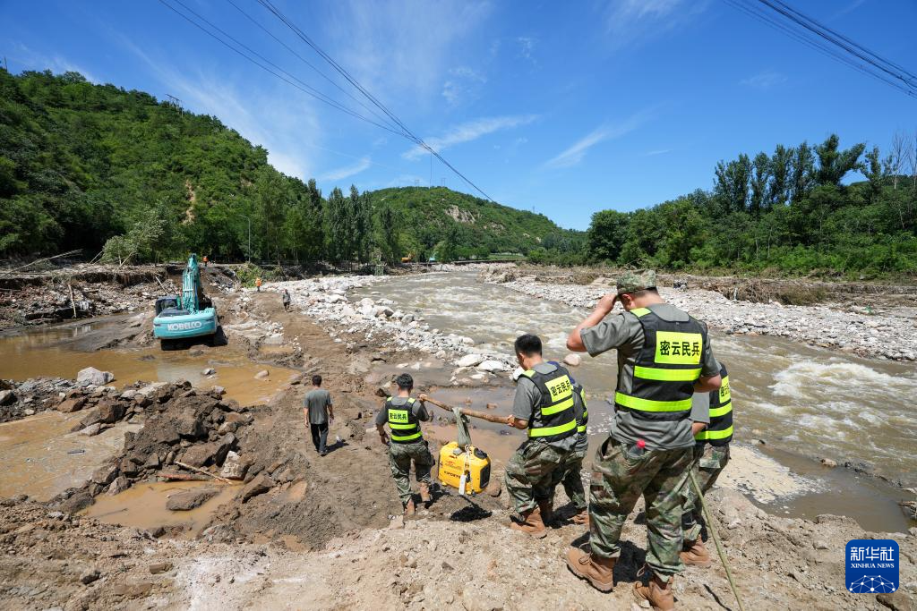 7月30日,在密云区冯家峪镇,救援人员向道路被阻断的村庄运送物资。