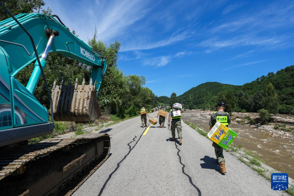 7月30日,在密云区冯家峪镇,救援人员为道路被阻断的村庄运送生活物资。