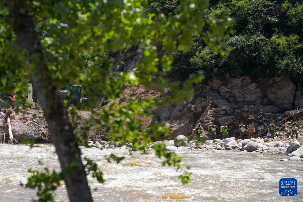 7月30日,在密云区冯家峪镇,救援人员为道路被阻断的村庄运送物资。