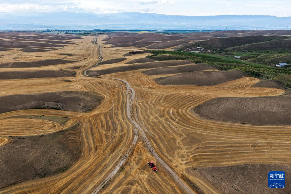 近日,在位于天山北麓的新疆维吾尔自治区伊犁哈萨克自治州特克斯县,成熟的小麦迎来收获。当地农民抢抓有利天气,开展夏收工作。