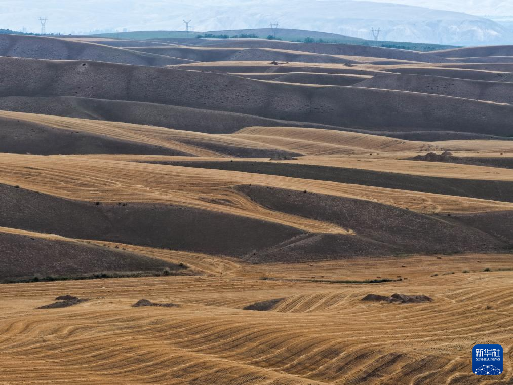 近日,在位于天山北麓的新疆维吾尔自治区伊犁哈萨克自治州特克斯县,成熟的小麦迎来收获。当地农民抢抓有利天气,开展夏收工作。