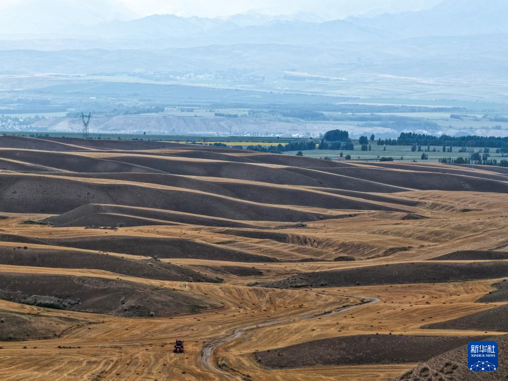 近日,在位于天山北麓的新疆维吾尔自治区伊犁哈萨克自治州特克斯县,成熟的小麦迎来收获。当地农民抢抓有利天气,开展夏收工作。